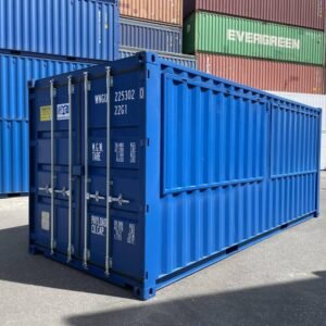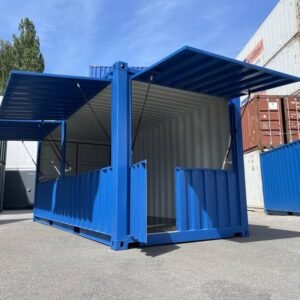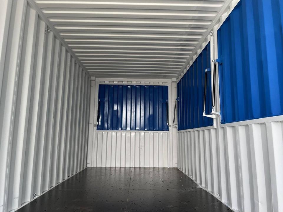 – Die Basis ist ein neuer, stabiler 20-Fuß-Seecontainer mit vier Türstangen und einer Sicherheitsbox, in enzianblau RAL5010.