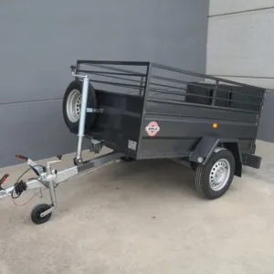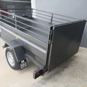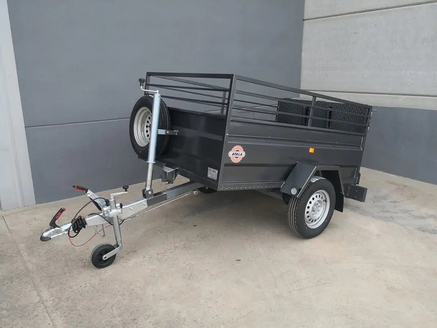 Offener Kastenanhänger mit Rädern an der Außenseite, aus 1,5 und 2,0 mm schwarzem Stahl, komplett geschweißt, grundiert und mit Polyurethan-Metallic-Lack lackiert, 1 Achse der Marke al-ko oder knott mit 1.000 kg (mma 750 kg), 3 Räder 155/80 r13, Stützrad 48mm, etc…
