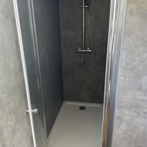 – Komplettes Badezimmer mit u.a. Kunststoff-Wandpaneelen, 1,20 x 0,80 großer Dusche mit Regeneffekt, wandhängendem WC und luxuriösen Badezimmermöbeln.