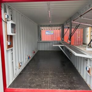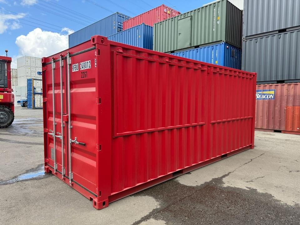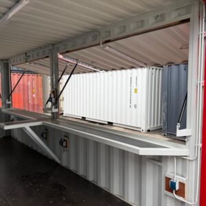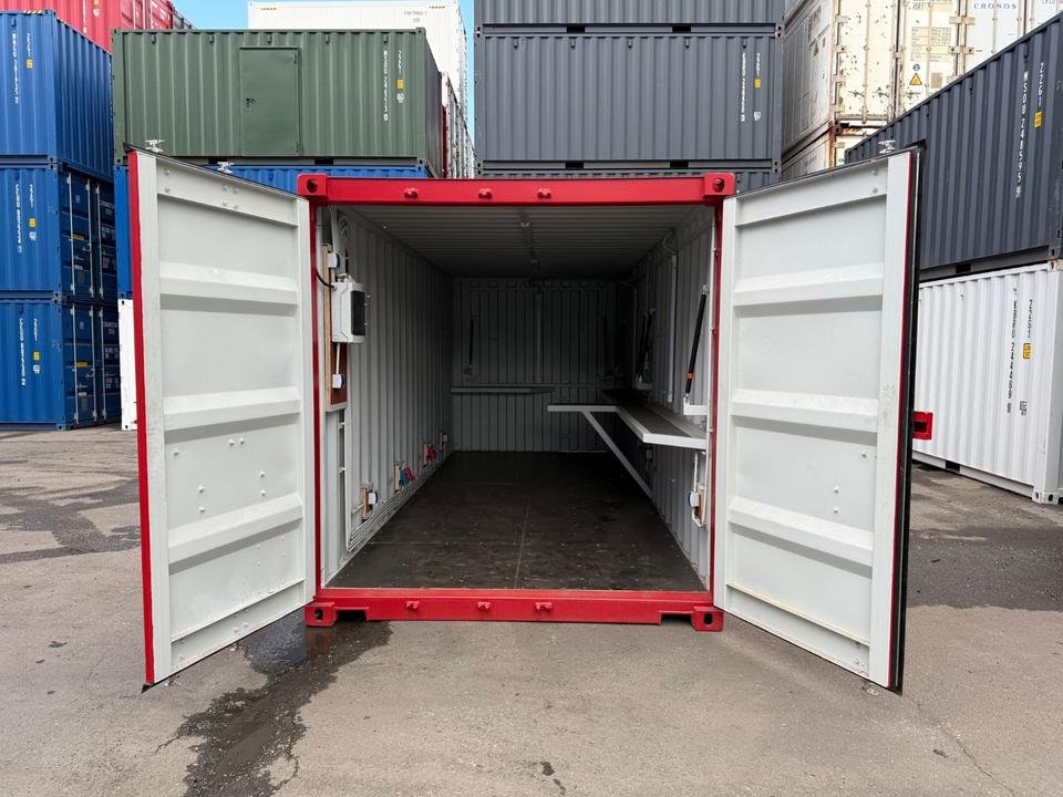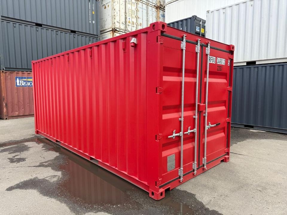 – Die Basis ist ein neuer, stabiler 20-Fuß-Schiffscontainer mit vier Türstangen und einer LockBox, in signalrot RAL3001.