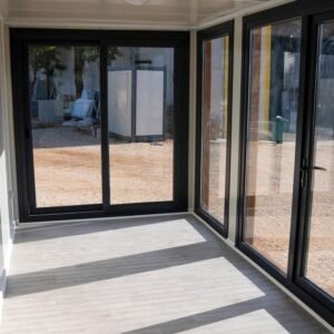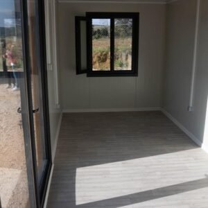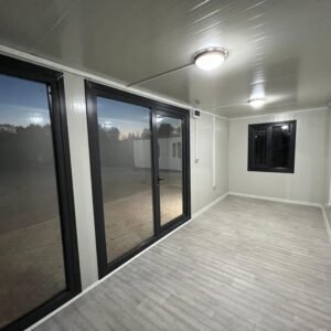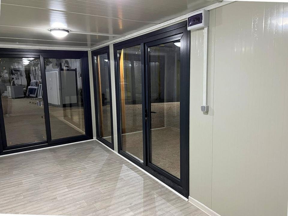 * Eleganz im Detail. Die großen Fenster bieten nicht nur eine hervorragende Aussicht, sondern sorgen auch für ein angenehm helles Interieur. Die moderne Bodengestaltung und die saubere Verarbeitung verleihen dem Raum eine professionelle Note. Gleichzeitig bleibt der Container durch die intelligente Raumnutzung gemütlich und funktional.