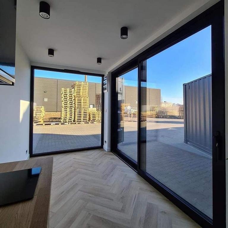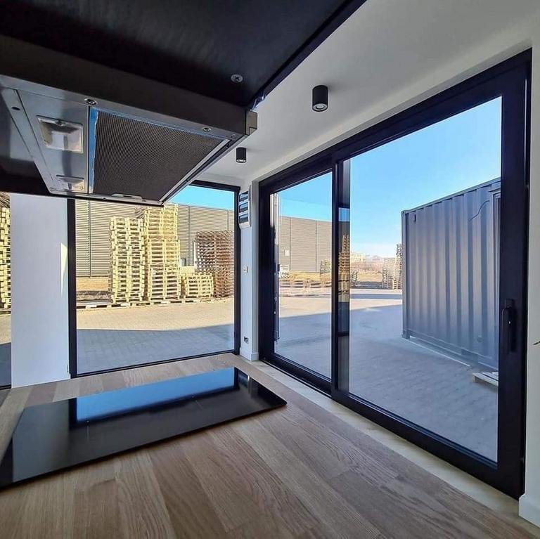 Eine Längsseite eines Standardcontainers (20ft x 8ft) wurde komplett entfernt und es wurden doppelverglaste Terrassenschiebetüren mit integrierten Jalousien eingebaut.
