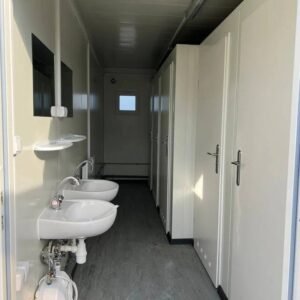 Der Innenraum ist ausgestattet mit5 separate abschließbare Sanitärkabinen y2 Waschbecken dies gewährleistet Privatsphäre und Funktionalität für die Nutzer. Oberlichtfenster und LED-Deckenbeleuchtung sorgen für hervorragende Helligkeit.