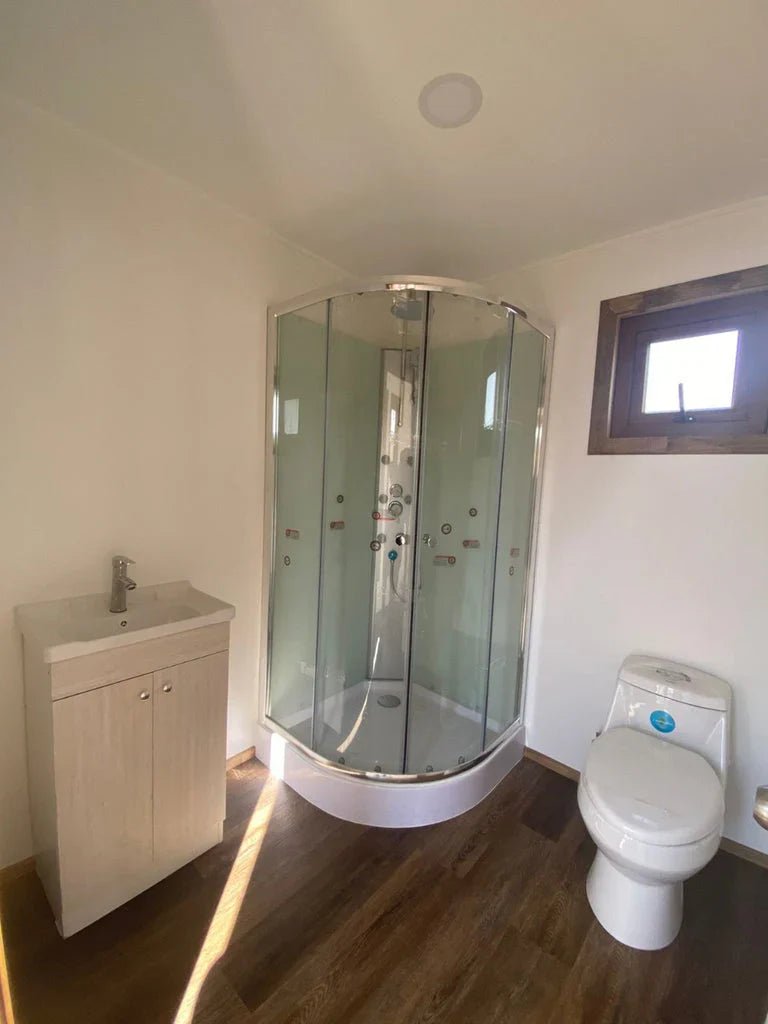 Innenverkleidung aus Osb und glattem Vulkanit Außenverkleidung aus Faserzement Vorgezogene Polyurethan-Dämmung in den Decken Glaswolle-Dämmung in den Wänden Klick-Vinylbodenbelag