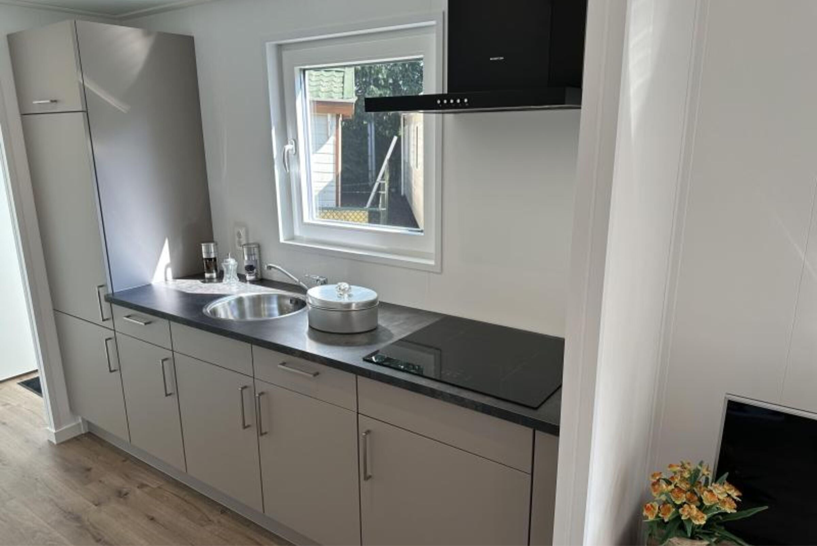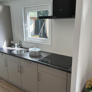 – Voll ausgestattete Küche mit Induktionskochfeld, großem Kühlschrank mit Gefrierfach, Spüle und Dunstabzugshaube.