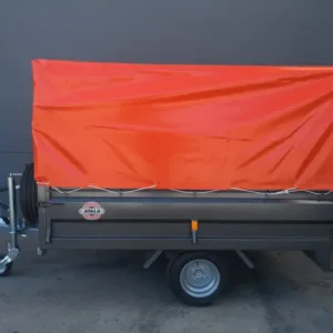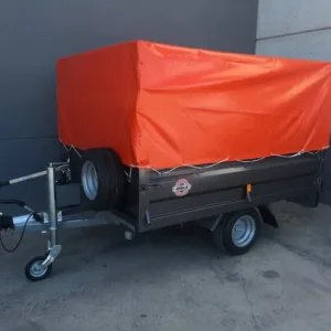 Beschreibung des Produkts: Offener Kastenanhänger mit Rädern an der Unterseite, aus 1,5 und 2,0 mm schwarzem Stahl, komplett geschweißt, grundiert und mit Polyurethan-Metallic-Lack lackiert, 1 Achse mit 1.000 kg Marke Al-Ko oder Knott (MMA 750 kg), 3 Räder 195/55 r10, 60 mm klappbares Stützrad, Trägheits- und Feststellbremse, hydraulische Kipp-Handpumpe.