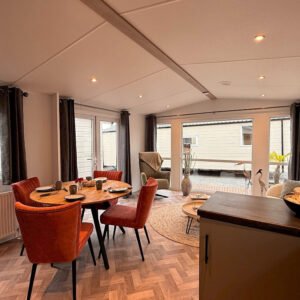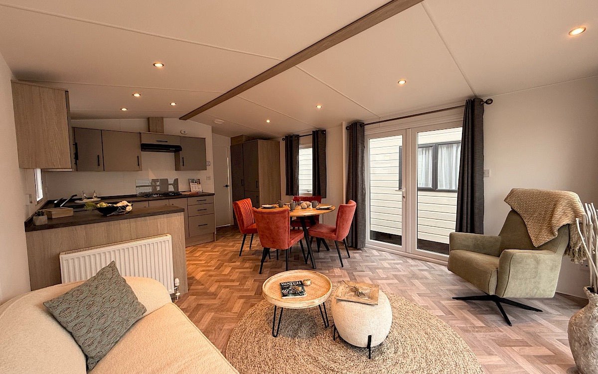 Dieses schöne Mobilheim bietet einen geräumigen Eingangsbereich, in dem Sie Ihre Mäntel und Taschen bequem aufhängen können. Der breite Eingang vermittelt sofort ein Gefühl von Geräumigkeit und Gastfreundschaft, so dass Sie sich sofort wie zu Hause fühlen. Der Ocean Super Plus verfügt über eine moderne U-förmige Küche mit integriertem Herd, Dunstabzug, Kühlschrank und Gefrierschrank. Es gibt sogar Platz für eine Mikrowelle und die Möglichkeit, einen Geschirrspüler hinzuzufügen, so dass Sie komplett ausgestattet sind.