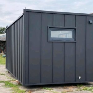 Außenverkleidung: Stahlblech mit modernem WPC-Holzdesign, langlebig und witterungsbeständig.