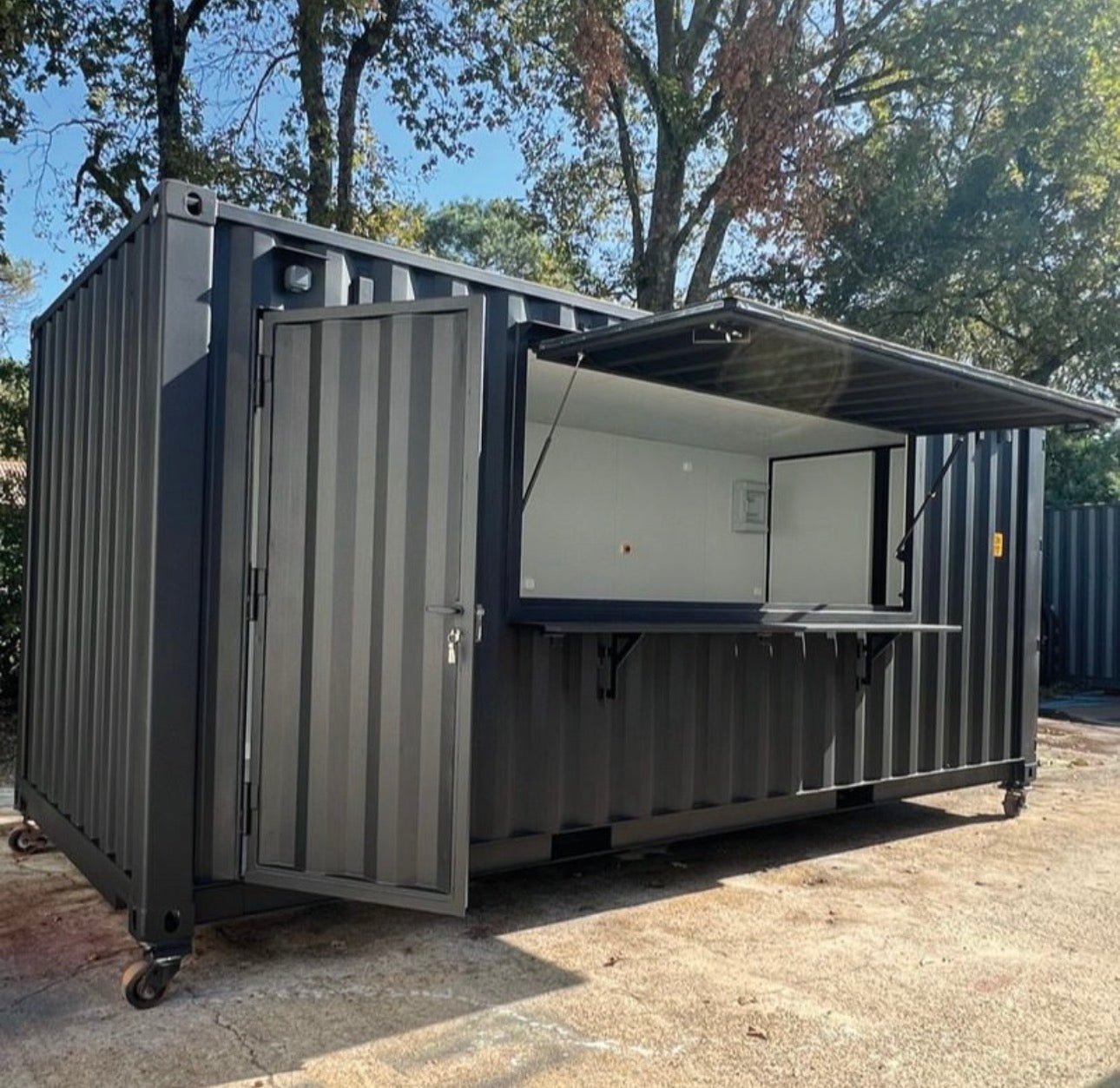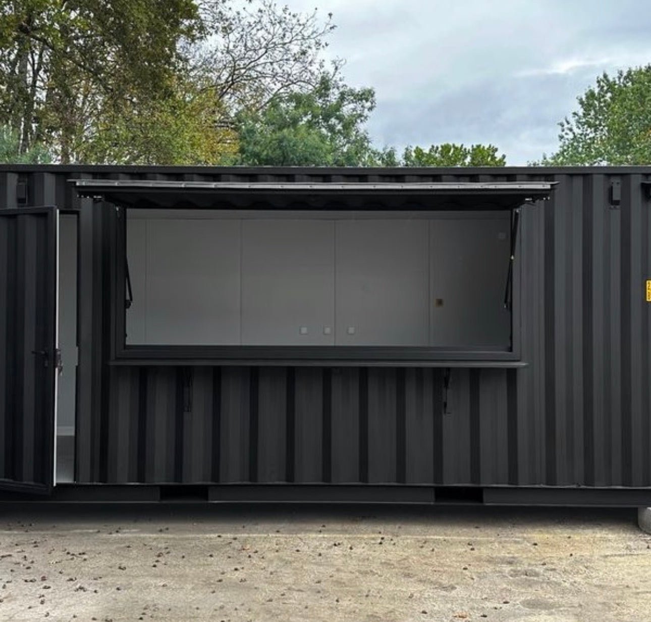 Einrichtung einer Snackbar, eines Foodtrucks, einer Guinguette, eines Kiosks oder einer Streetfood-Bar in einem 20′-Seecontainer auf der ersten Reise.