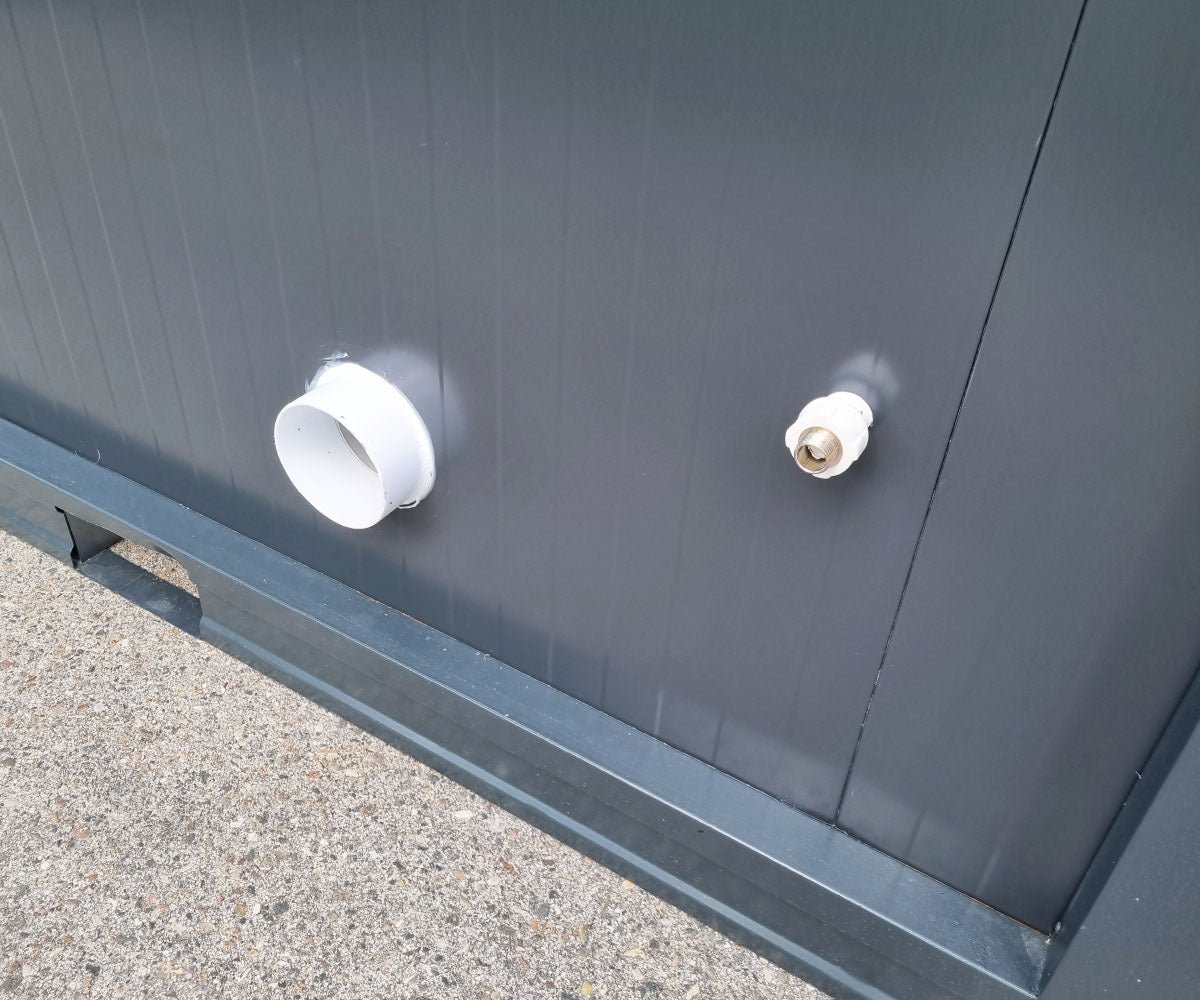 Die Containertüren sind aus robustem Stahl gefertigt und verfügen über einen abschließbaren Griff und zwei Schlüssel pro Kabine. Die Abmessungen des Ganges betragen 65 x 190 cm (Breite x Höhe). Der Container ist außerdem mit einem PVC-Fenster von ca. 60 x 40 cm ausgestattet.