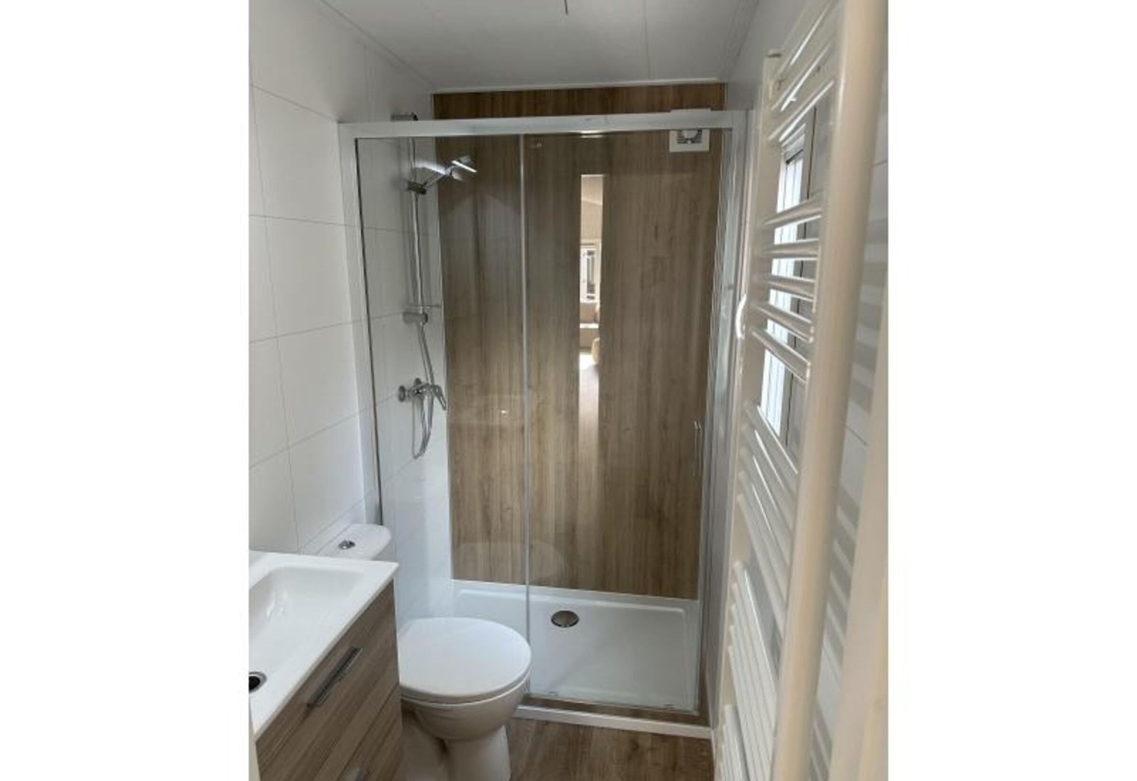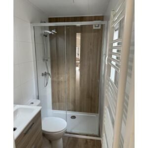 – Komplettes Badezimmer mit Fibo Trespo Wandpaneelen, 1,20×0,80 Dusche, Toilette und luxuriösen Badezimmermöbeln.