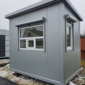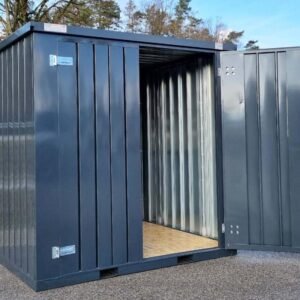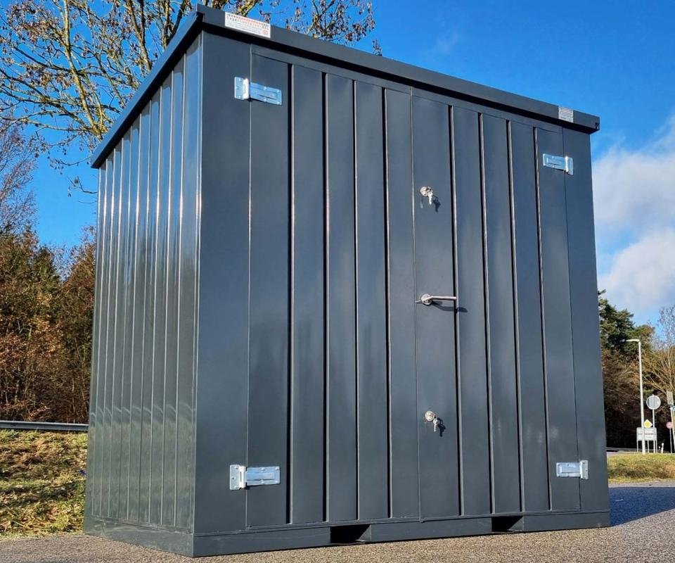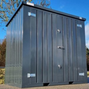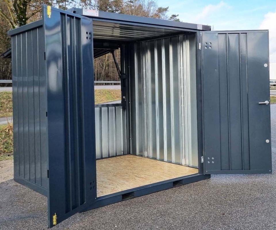 Dadurch ist der Container bei Bedarf voll beweglich und kann mit einem Gabelstapler oder Kran angehoben werden, auch wenn sich Inventar darin befindet.