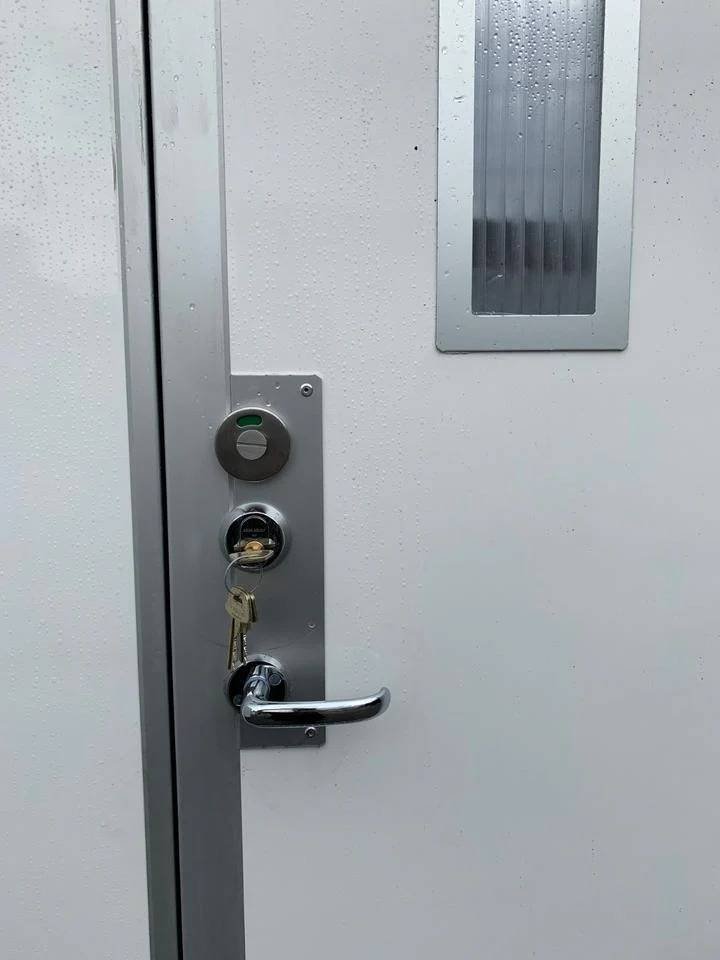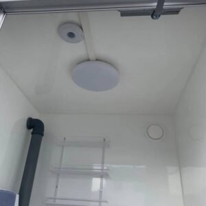Das Modul ist ausgestattet mit einemtoilette mit einem 500-Liter-Abwassertank und ein Waschbecken mit einem 30-Liter-Wassertank. Für Ihren Komfort gibt es eine elektrische Heizung, einen Spiegel, Papier- und Seifenspender, einen Kleiderständer und einen Abfalleimer. Die LED-Beleuchtung mit Bewegungsmelder sorgt für eine effiziente Energienutzung.