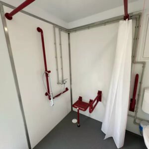 • Dusche mit Klappsitz, Haltegriff und Duschvorhang.