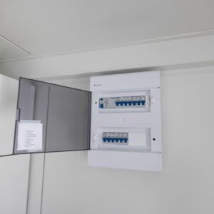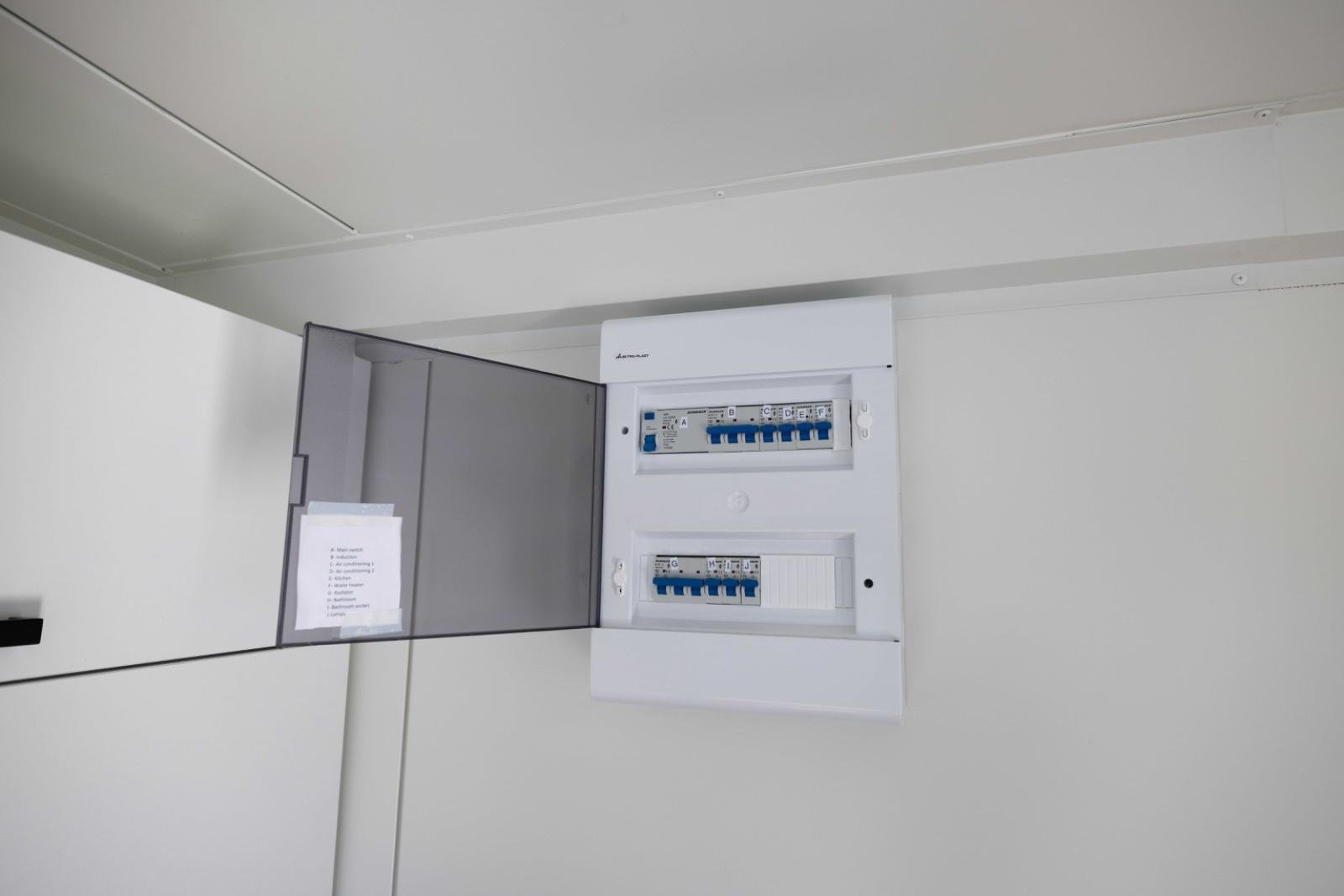 * Elektroinstallation: Verteilerkasten; 4 LED-Lampen; 7 Doppelsteckdosen, 2 Einzelsteckdosen einschließlich Schalter, 2 Außenleuchten; Wandverkabelung.