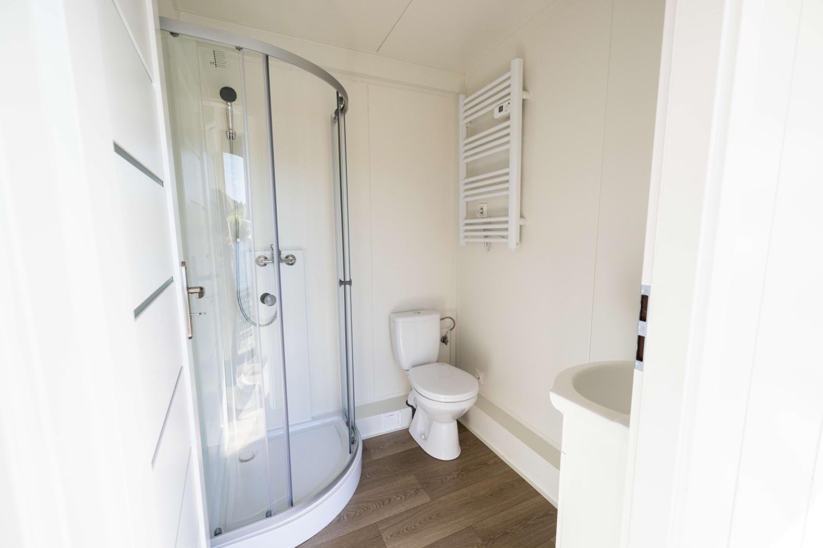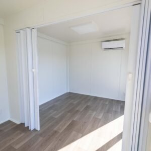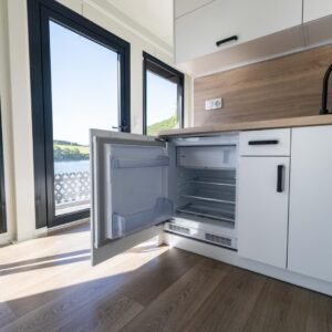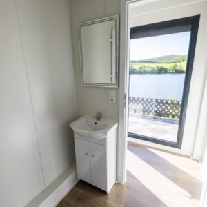 * Wände, Boden und Dach: PIR-Sandwichpaneele (100 mm) mit Polyurethanfüllung für hervorragende Isolierung und Energieeffizienz (WDK: 0,23 W/m²). PVC-Boden in Holzoptik mit zusätzlicher OSB-Bodenplatte (15 mm). Dach mit 5 % Gefälle für eine effiziente Wasserableitung.