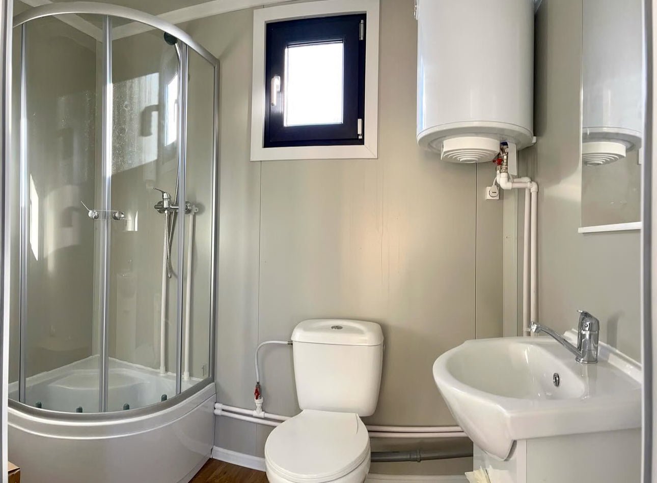 Volles Badezimmer: Mit Dusche, WC, Waschbecken und Warmwasserbereiter.
